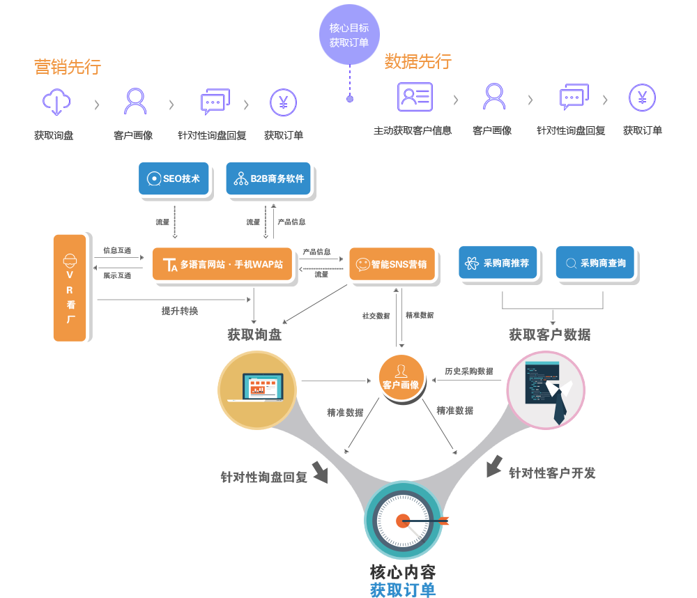SEO技術(shù)通過搜索引擎為網(wǎng)站帶來流量,網(wǎng)站上展示VR全景看廠提升轉(zhuǎn)化率,產(chǎn)生更多詢盤。對詢盤進(jìn)行曾經(jīng)采購行為分析,客戶畫像,進(jìn)行深度SNS挖掘獲得客戶詳細(xì)情況,并有目的地精準(zhǔn)聯(lián)系,獲得訂單。